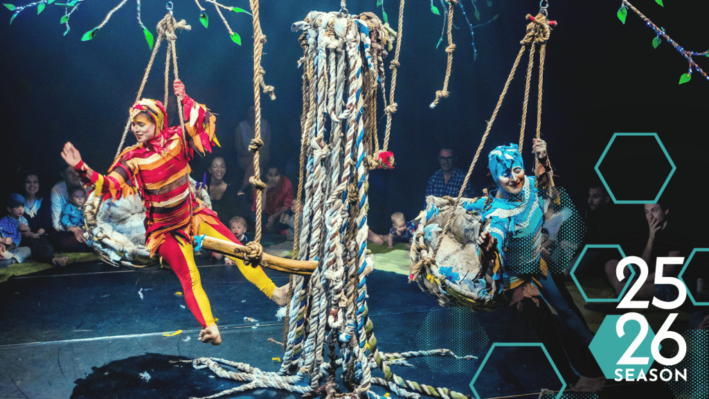 Tweet Tweet! is a 30-minute contemporary circus performance experience for our youngest audience, aged 0-5 years and their caregivers. The show takes place on a magical tree apparatus. The performers move from the nests, up into the aerial tree canopy, through the rope tree trunk, and on the floor. There is a large forest floor carpet that lies beneath the tree branches for the audience to sit and lie on.